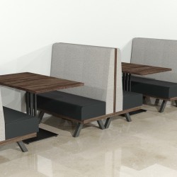 Muebles para restaurantes booth para restaurante en modulo de 120 cm. Fabricado en mdf de 18mm y termindos acojinads en asiento con vinil con espuma de 35 kgs de densidad, respaldo con tela en patron “v” sobre espuma de 24 kgs.