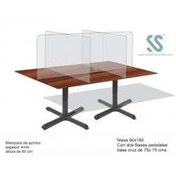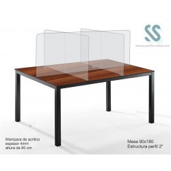 Mesa para comedor industrial, fabricada en estructura de acero en perfil tubular calibre 16 color negro, con cubierta en mdf de 18mm, terminado en laminado plastico color madera, con cantos en pvc de 2mm. Mamparas de acrilico de 4mm altura de 60 cm.