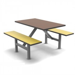 Mesa para area de fast food comedores industriales, areas de comensales fijas. Mesa banca con asientos fijos, fabricada en estructura de acero pintada a color elegido, con cubierta de 120×75 cms, con dos asientos de 120 x 30 cm, cubierta y asientos en mdf de 30mm, con una cara en laminado plastico a elegir y cantos en pvc de 2mm color negro o a elegir.