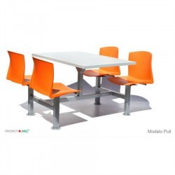 Mesa con 4 sillas fijas, modelo Pull, asientos fijos en plastico de polipropileno, en varios colores a elegir, estructura en metal ptr de calibre 16, metal acabado pintura electroestatica en colores a elegir. cubierta melamina.