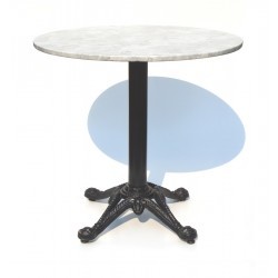 Mesa con cubierta de marmol de 80 cm de diamtro o 80×80 cm, con base tipo bistro de 4 puntas, la base en fierro de fundicion.