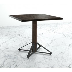 Mesa para restaurante de diseño. Mesa en formica sobre df de 30mm, base pedestal con poste de madera, cruz de acero en solera doblada.