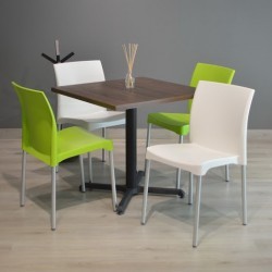 Paquete de sillas y mesa para restaurante; uso rudo intenso: Sillas apilables de plástico y mesa cubierta melamina 80×80 cm con base de acero de fundición 75×75 cm, en colores a elegir.