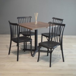 Paquete económico, 4 sillas de plástico y mesa con cubierta de melamina de 80×80 cm, cantos en pvc 2mm y base en acero de fundición color negro de 75×75.