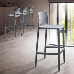 Banco alto de 4 patas con estructura de acero recubierto en tecnopolímero, con descansa pies. Altura de asiento 0.76 mts.